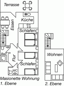 3-Zimmer-Apartment, 1.OG, ca. 70 qm, offene Einbauküche mit 4-Platten-Ceranfeld, Backofen, Geschirrspüler, sep. Sitzplatz, 1 Duschbad/WC, 1 Gäste-WC, 1 Schlafzimmer mit Doppelbett, 1 Schlafzimmer mit 2 Einzelbetten, Wohnzimmer (2. Ebene) mit gemütlicher Couch (5. Schlafplatz), TV, Stereoanlage, Terrasse, Stellplatz am Haus, WLAN gegen Gebühr möglich